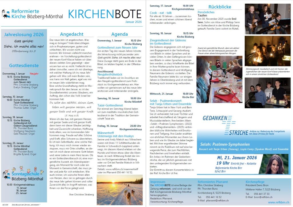 Das gedruckte Publikationsorgan unserer Kirchgemeinde ist der Kirchenbote. Er erscheint in der Regel monatlich und liegt der Zeitschrift “reformiert.” bei. Diese wiederum ist die redaktionell unabhängige Mitgliederpublikation der reformierten Aargauer Landeskirche.